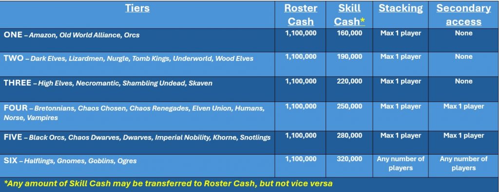 3) To allow flexibility with the use of roster funds so that races wanting extra cash for a full range of positionals, rerolls, a bench etc. are free to add it